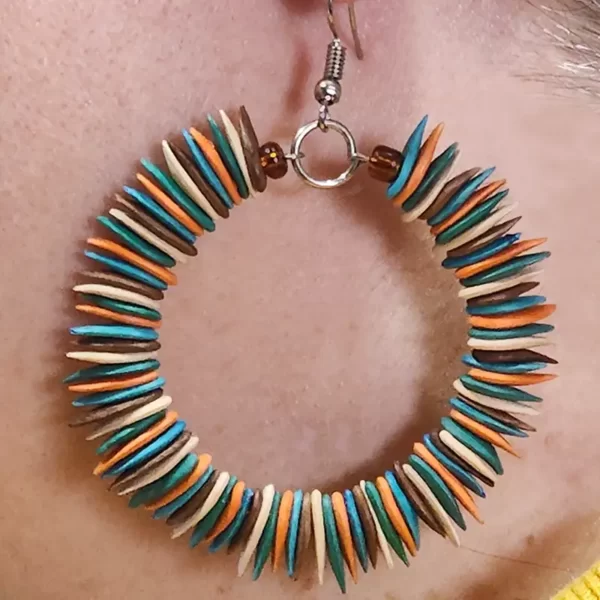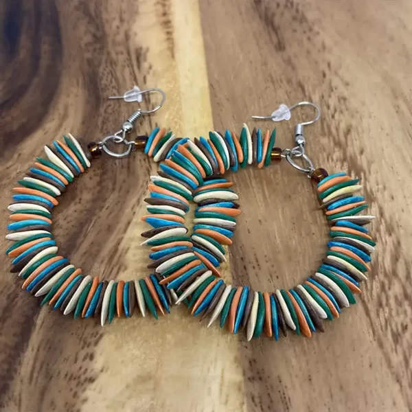 South American artisans handmake these earrings from dried melon seeds. They offer a variety of natural dyes made from plants and fruits, making each piece unique and all-natural. These earrings add a pop of color to any outfit. The skilled artisans from Colombia design and handmake each pair. In Colombia, artisans also use melon seeds to create other pieces, such as bracelets and collars.